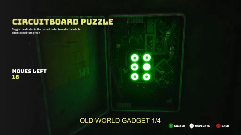 Interact with the circuit board at the end corridor. To solve the puzzle you need to toggle the diode in the correct order to make the whole circuit board turn green. The important point to keep in mind is that toggling one will change the color of the subsequent one as well.