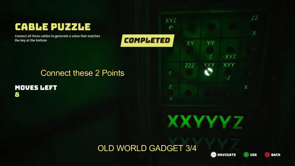 Solve the cable puzzle to open a gate that leads you out in the open area.