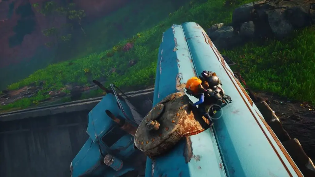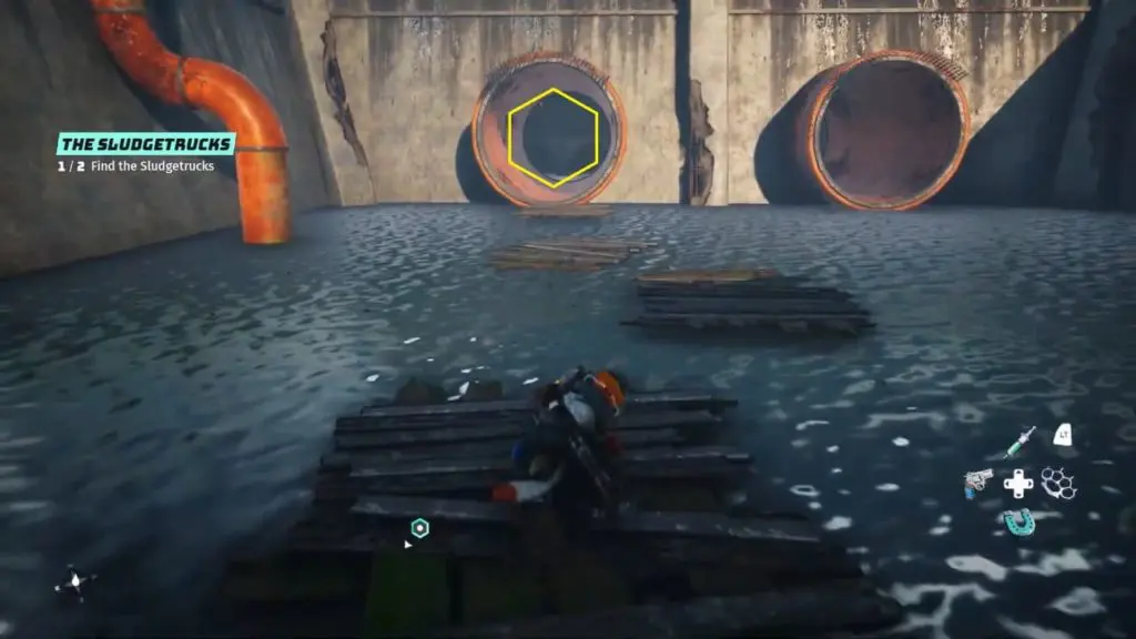 - Head to the right to find a large empty pool and a sludge truck/oil tanker propped up over the pool