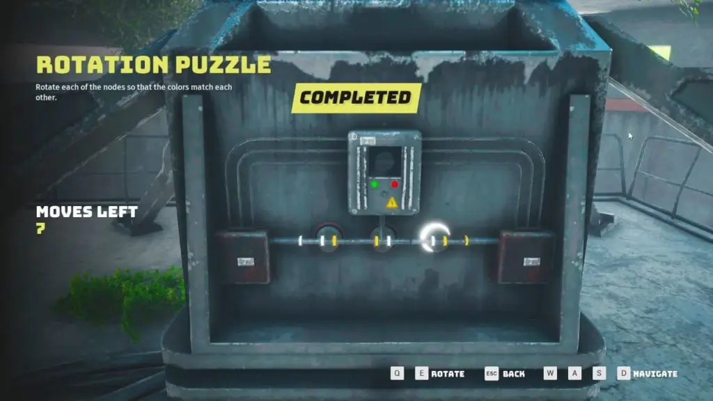 After reaching the desired location, go into the building and approach the generator to solve the Rotation Puzzle. Match the colors by rotating the nodes to matching up the color symbols. Once this puzzle is complete you will have control of the satellite dish above.