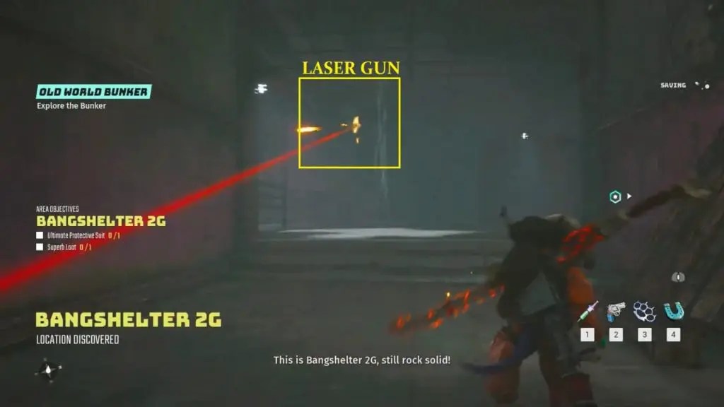 Once you’ve reached the location defeat enemy at the entrance. Head inside the bunker. Destroy the laser gun. Follow the linear path to located the Radioactivity Suit in a glass container.