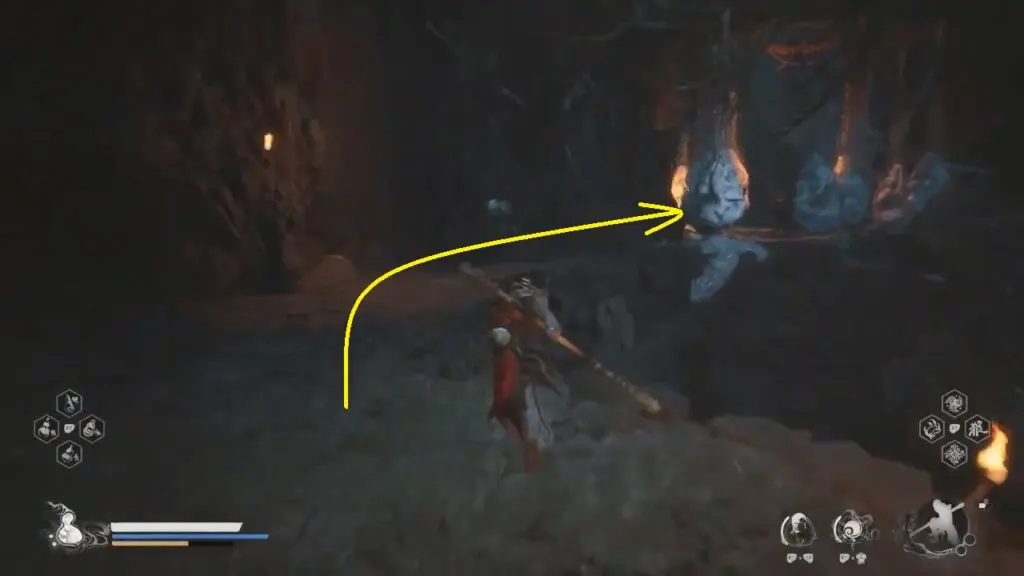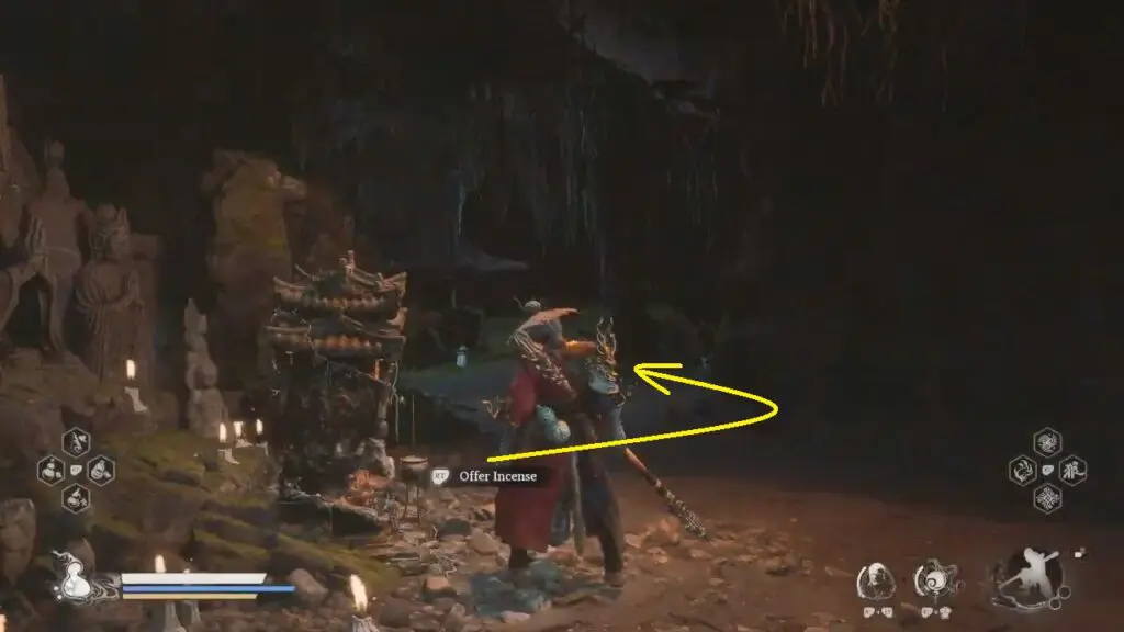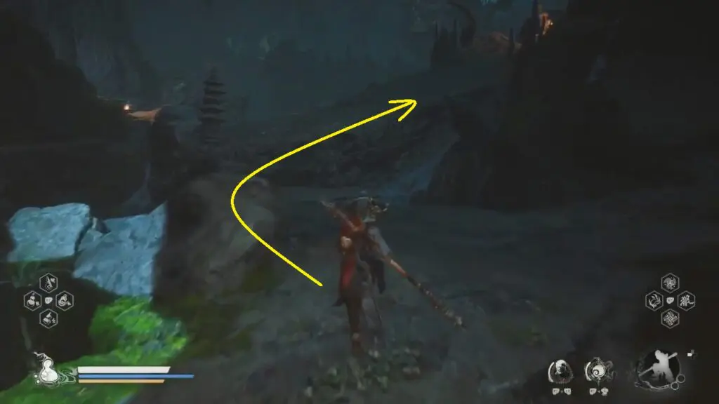 Go down the slope on the left before the Buddha statue and cross the area with hanging larvae.