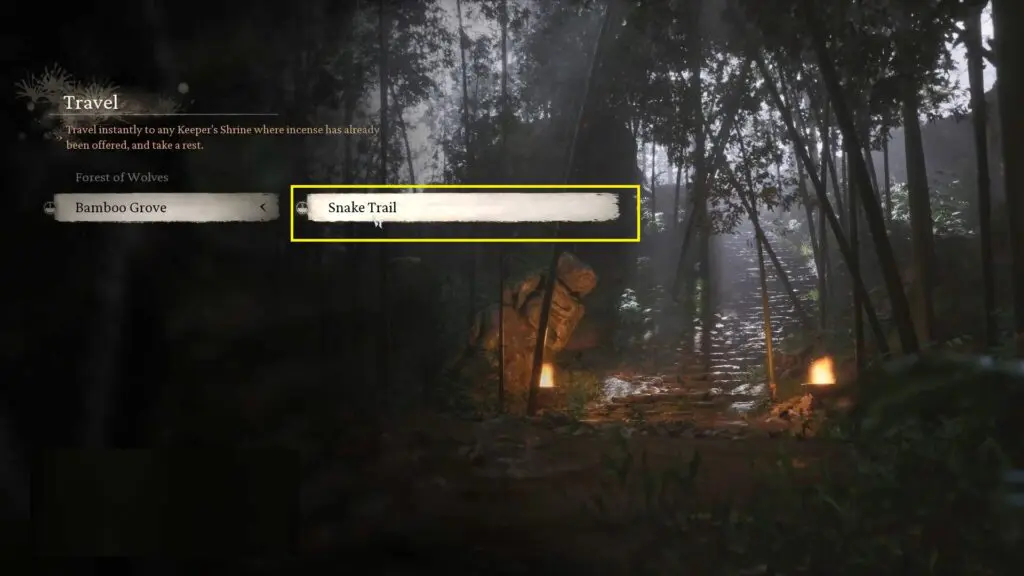 To locate the second bell, fast-travel to the Bamboo Grove> Snake Trail. Go upstairs and follow the trail through the forest.