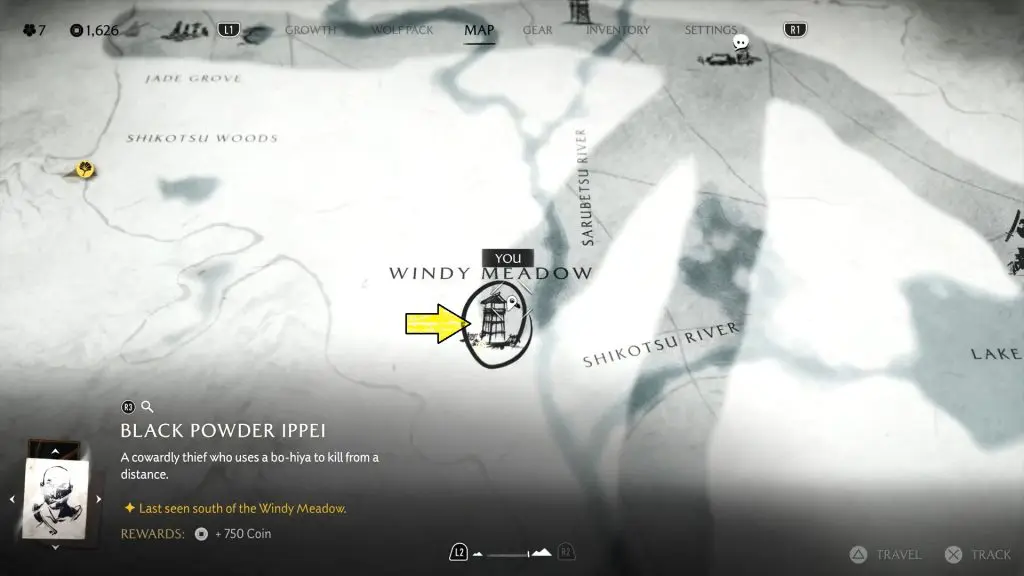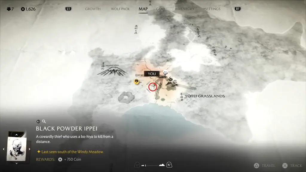 The Black Powder Ippei bounty is located near the Watchtower at Windy Meadow in the Yotei Grasslands area.