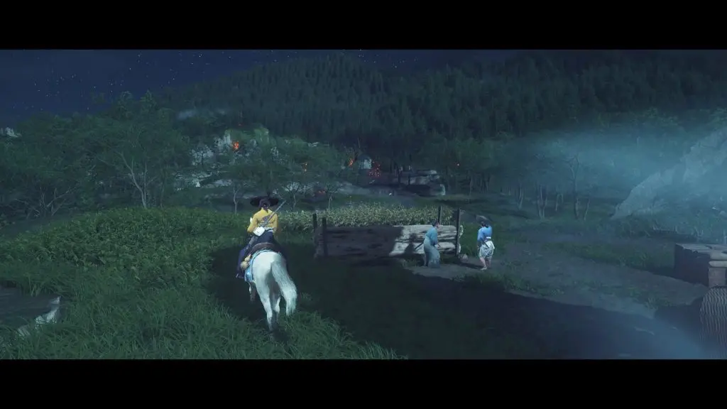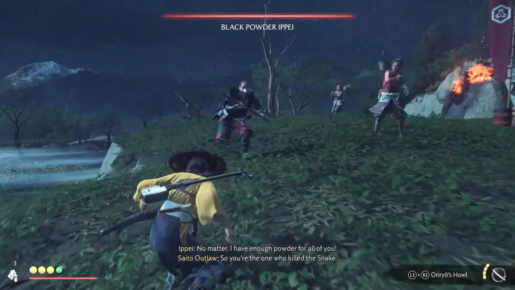 To find the bounty, look toward the south side of the Hilltop Watchtower to notice bursts of fire and smoke rising into the sky. This seems to be cannon fire from that direction. Follow the path of the explosions across the grassy slopes, and you’ll find Black Powder Ippei standing on a nearby hill, firing a cannon.