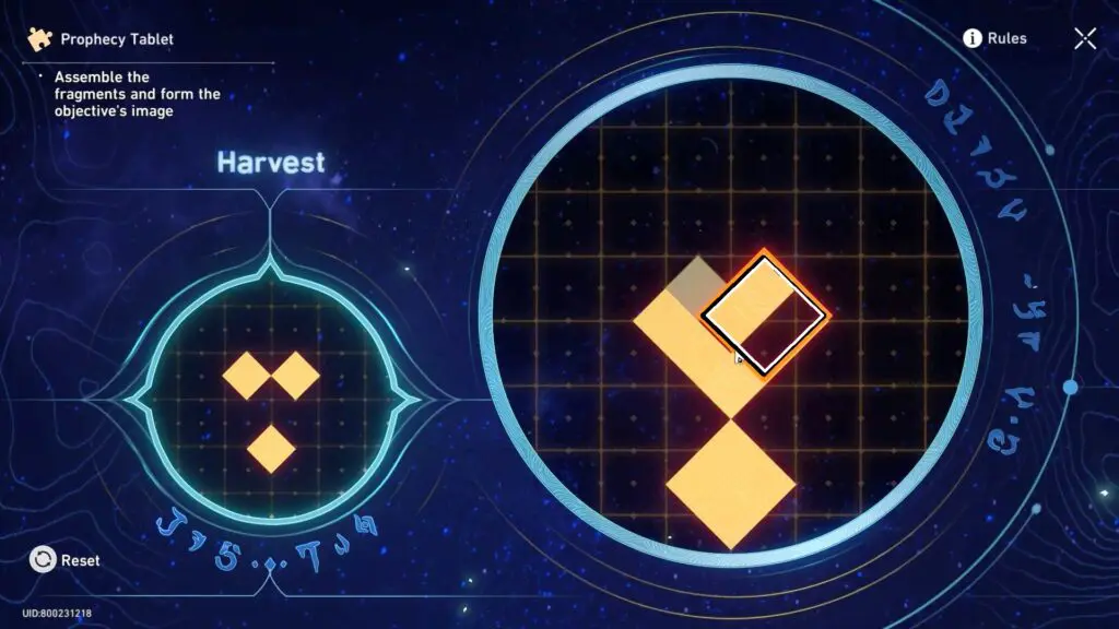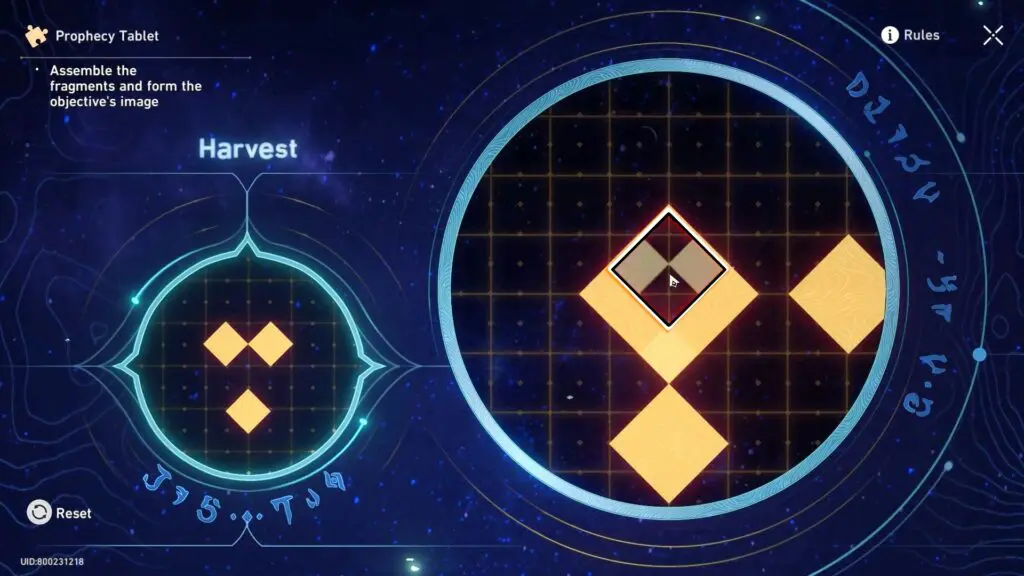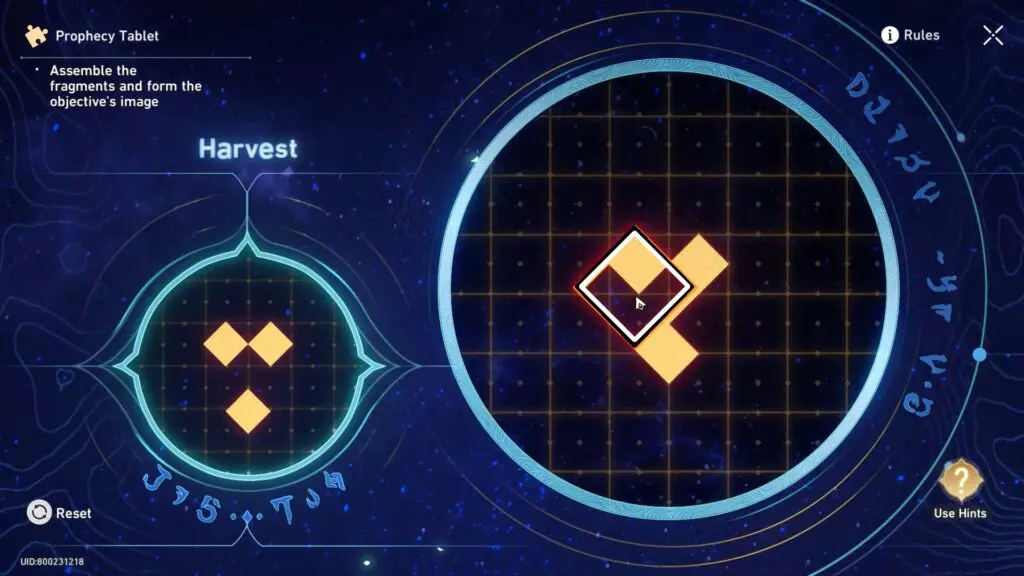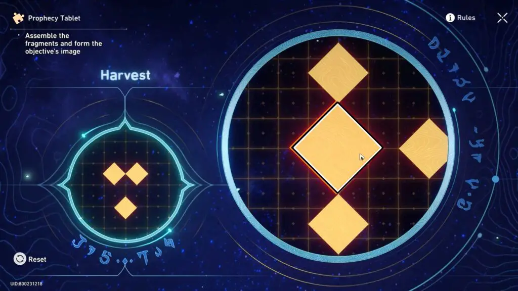To solve the Prophecy Tablet Puzzle, the player has to arrange fragments to match the pattern shown on the left and align them with the base image. As you move the fragments, any parts that overlap will temporarily disappear. However, if you separate the fragments the hidden parts will reappear. The goal of solving the Prophecy Tablet Puzzle is to carefully combine and position the fragments to recreate the correct image and complete the puzzle.