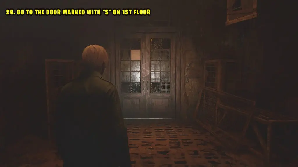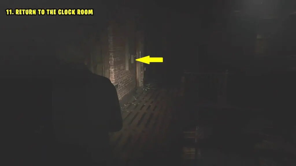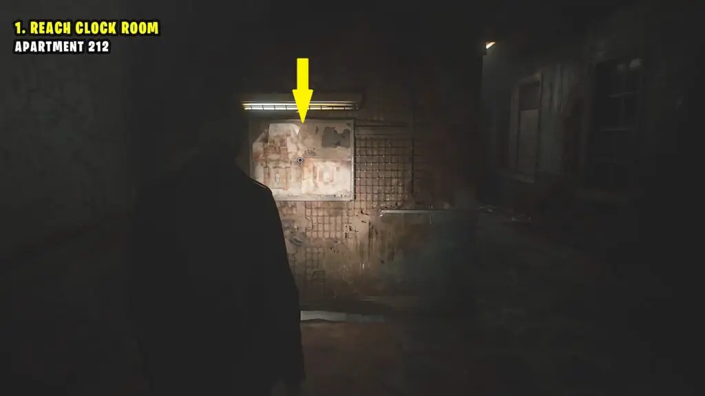 After collecting the Key of Resilience, exit the room and make your way to the location shown in the picture below. Use the key to open the door there. Then proceed ahead to reach the location marked in the second picture below. Climb up the staircase there to reach the second floor. Then make your way to room 212 (Clock Room).