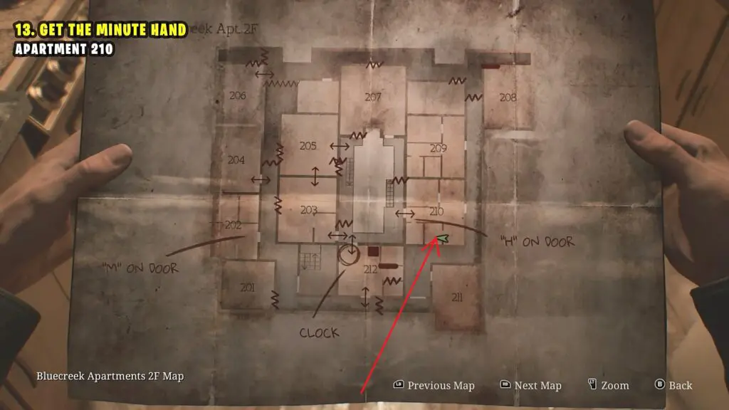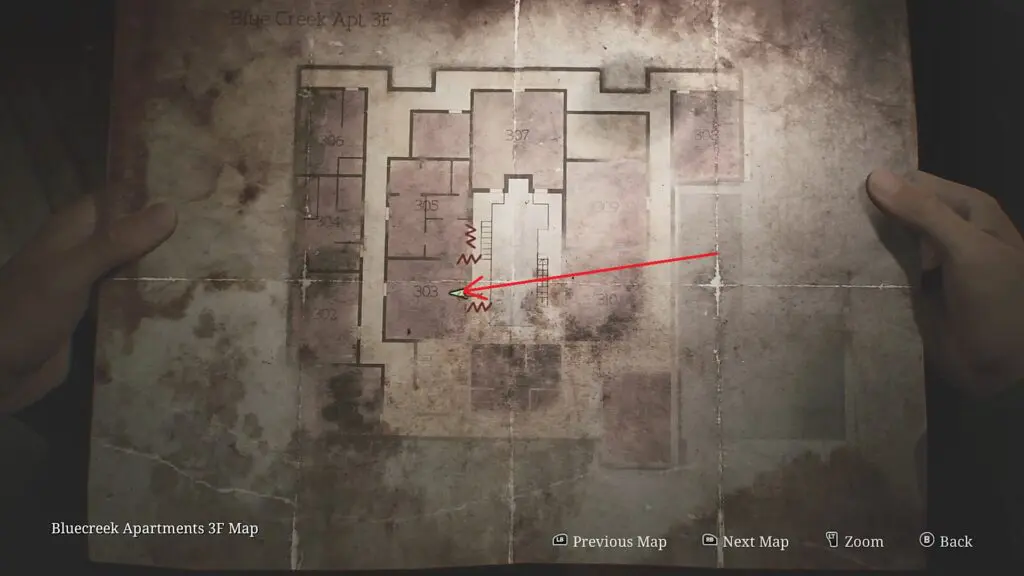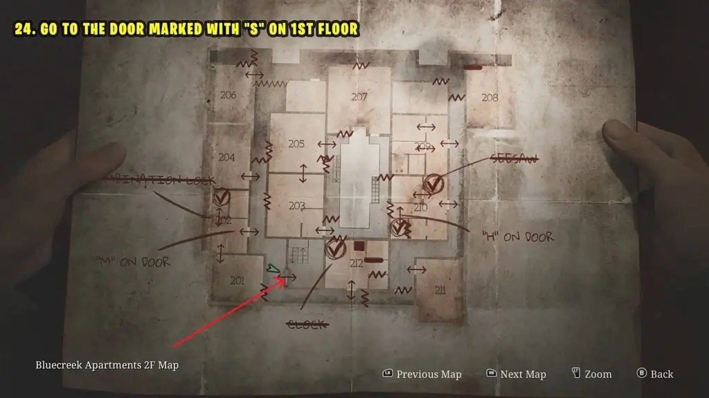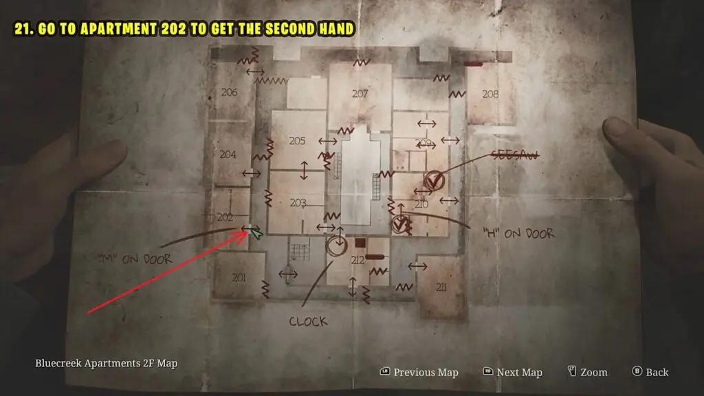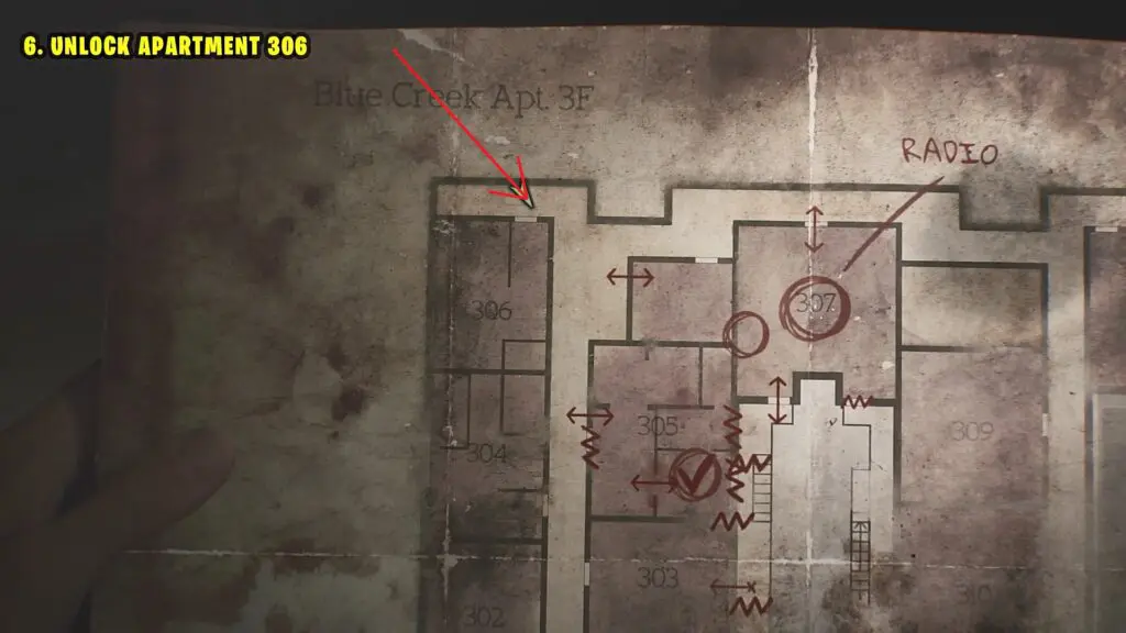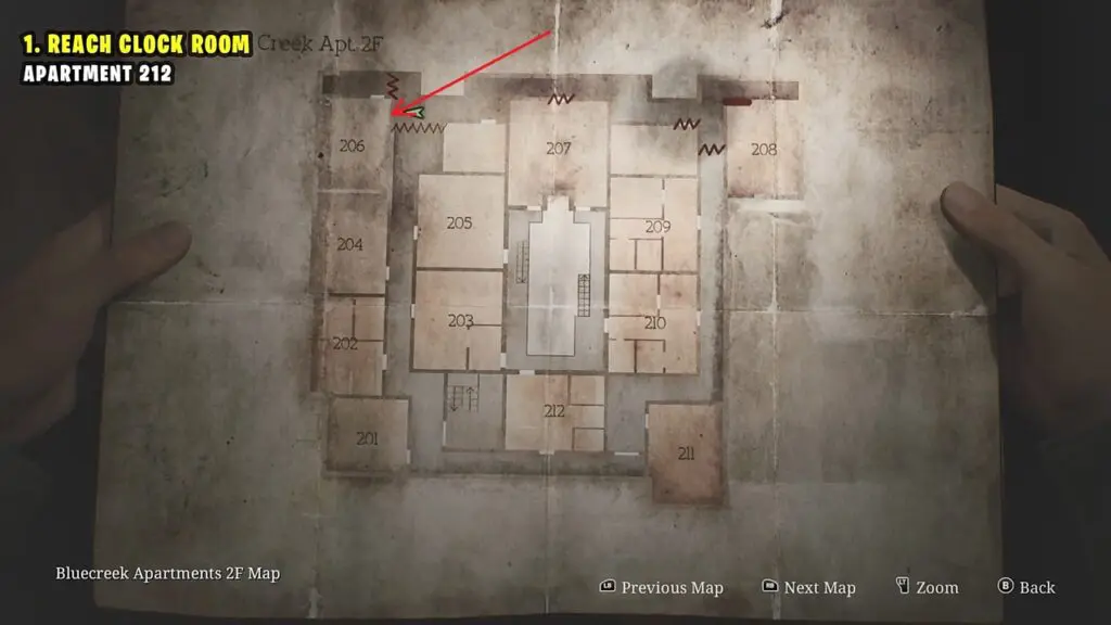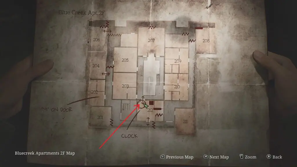 As the area starts, proceed in the hallway and soon you will reach a board containing the Blue Creek Apartment map as shown in the picture below.