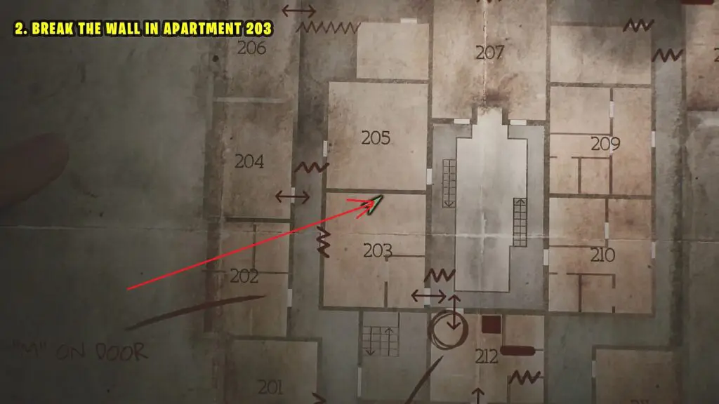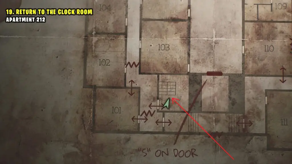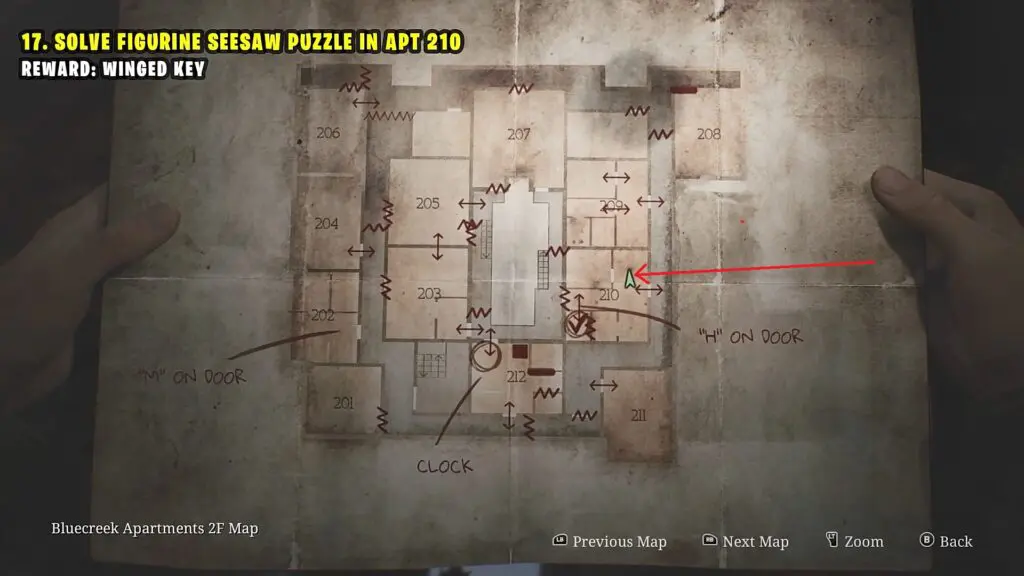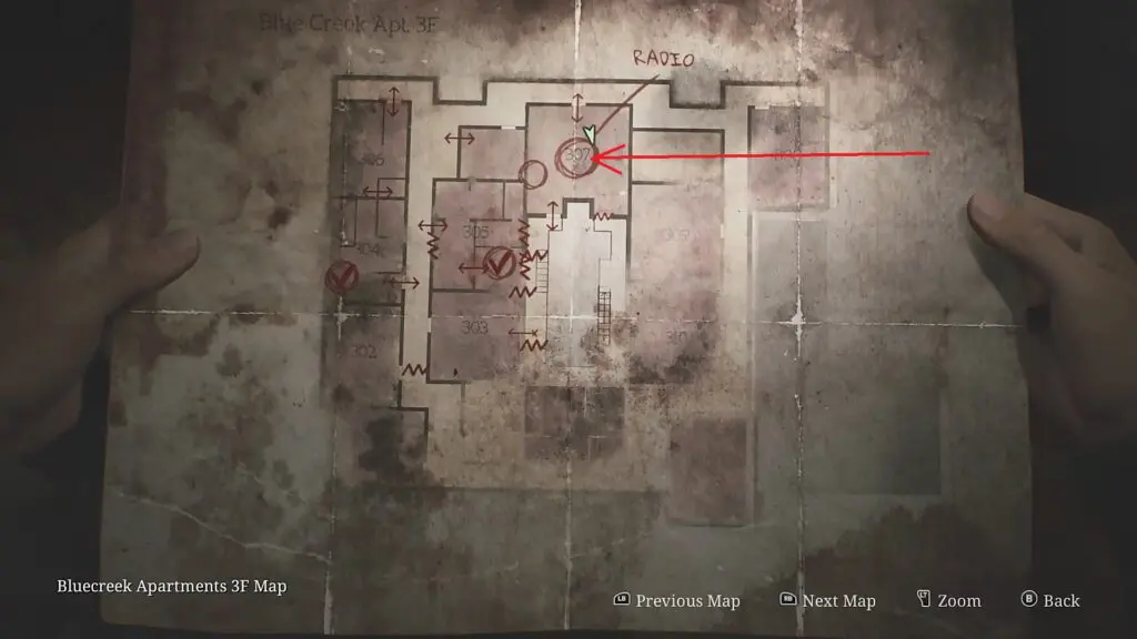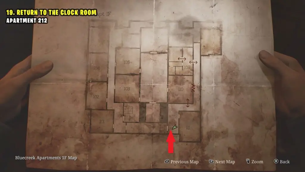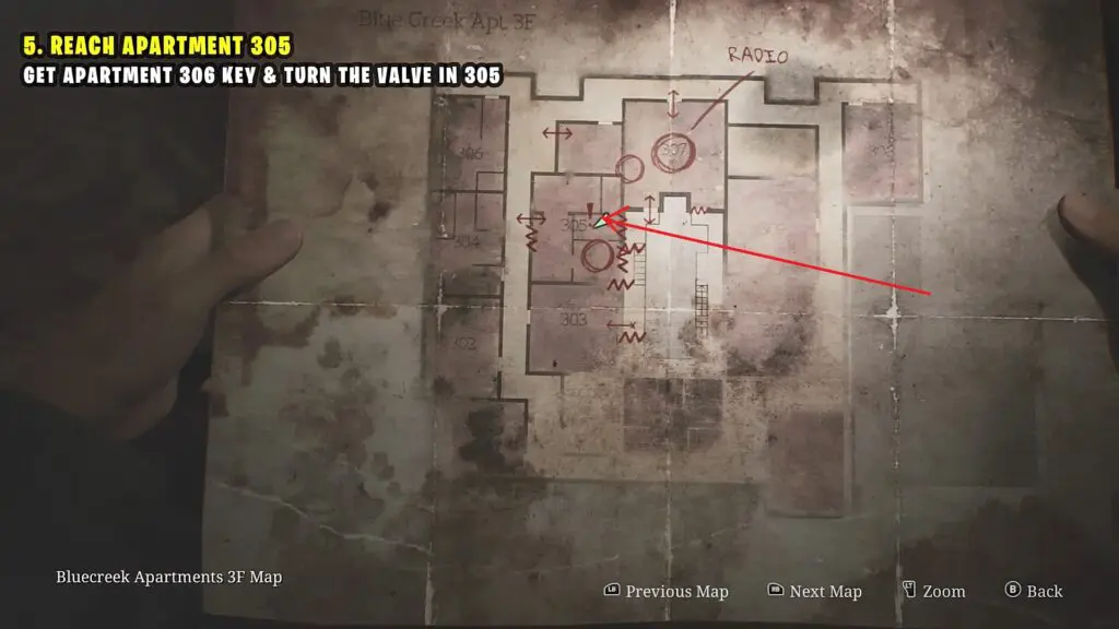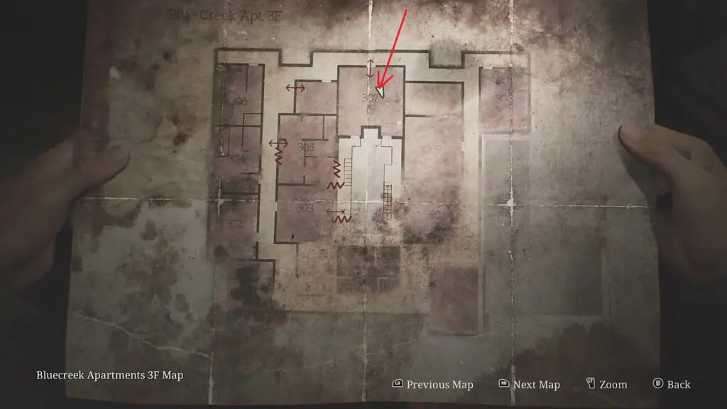 As the area starts, proceed in the hallway and soon you will reach a board containing the Blue Creek Apartment map as shown in the picture below.