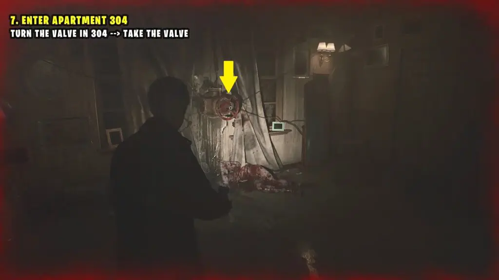 Now go inside and crawl through the hole in the wall to reach Room 304 as shown in the pictures below. Defeat the enemies there and then turn the valve there as shown in the second picture below. Take the valve with you to use it later.