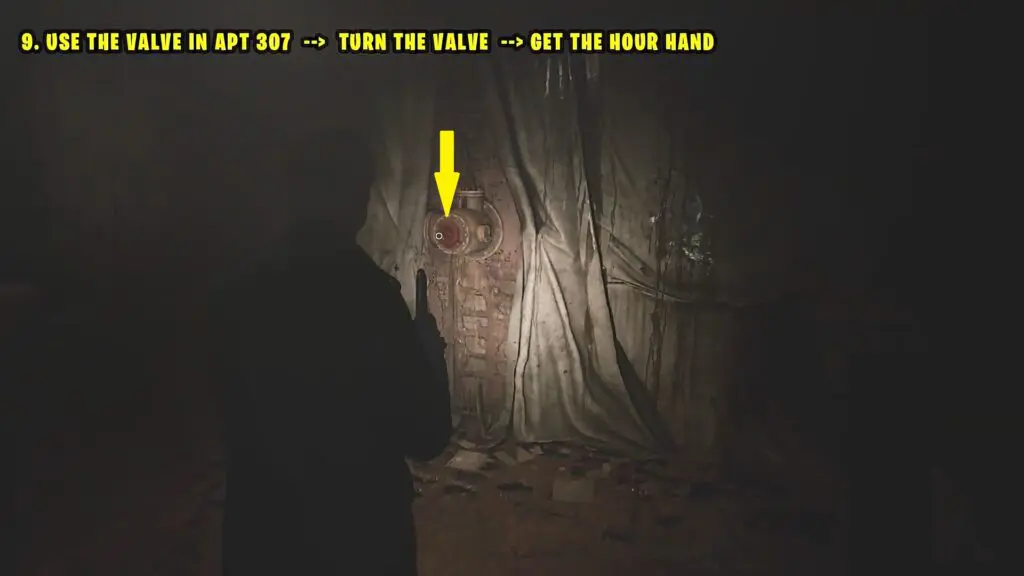 Make your way back to Room 307 (Radio Room). Enter the small room next to the main room. Insert the valve into the socket there as shown in the second picture below. Then turn the valve to release the final chain. This will make the radio fall down. Go to the fallen radio and pick up the Hour hand as shown in the third picture below.