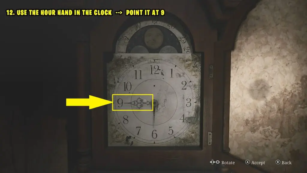 Interact with the clock and insert the hour hand. Then point the Hour hand to ‘9’ as shown in the picture below. This will open the door marked with ‘H’.
