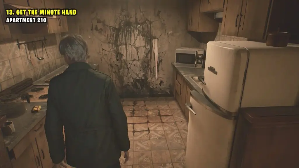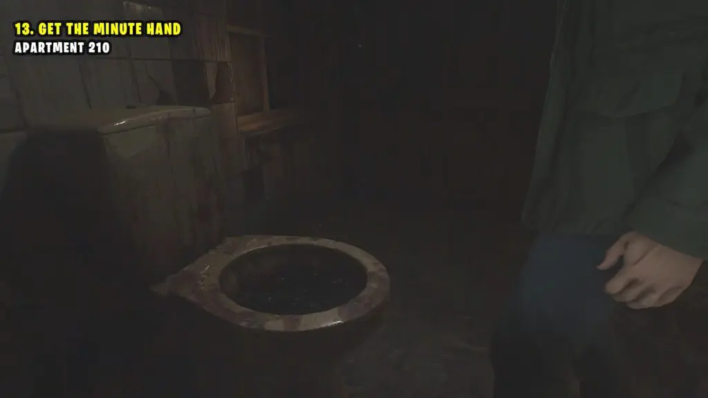 Exit the clock room and go right to reach the door marked ‘H’. Go through the door to enter Room 210. Go straight ahead and then turn right to reach the kitchen. Break the wall there as shown in the pictures below. Then go through the hole and interact with the toilet there as shown in the third picture below to get the Minute hand. Now, reaching back to the clock will take you some time. Keep following this guide to see how to get back there.