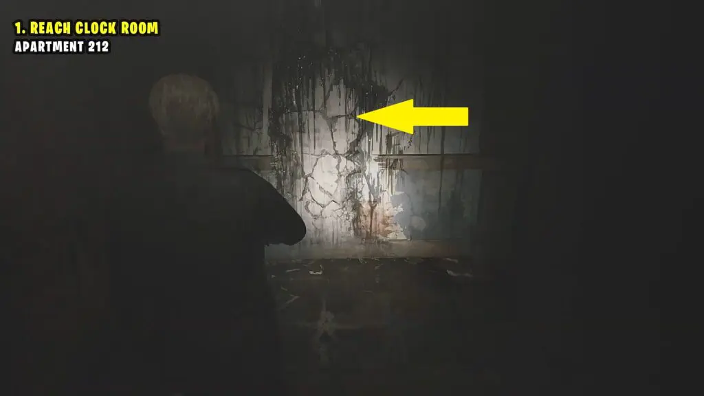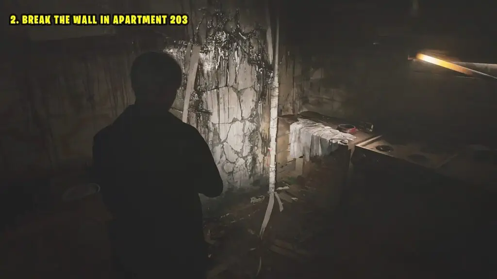 Exit the clock room and go to Room 203. Then break the wall at the location shown in the pictures below.
