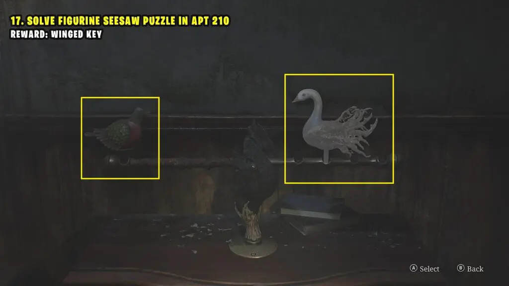 Once you have the three figurines, go back to the Seesaw Puzzle in room 210 at the location shown in the picture below. Now open your inventory and combine Malformed Figurine and Wooden Swan Head to get Swan Figurine. Place the Pigeon Figurine and the Swan Figurine in the Seesaw at the position shown in the second picture below. This will make the Seesaw come into an equilibrium, and you will get Winged Key. The location, where you need to place the figurines might differ based on the difficulty of the game.
