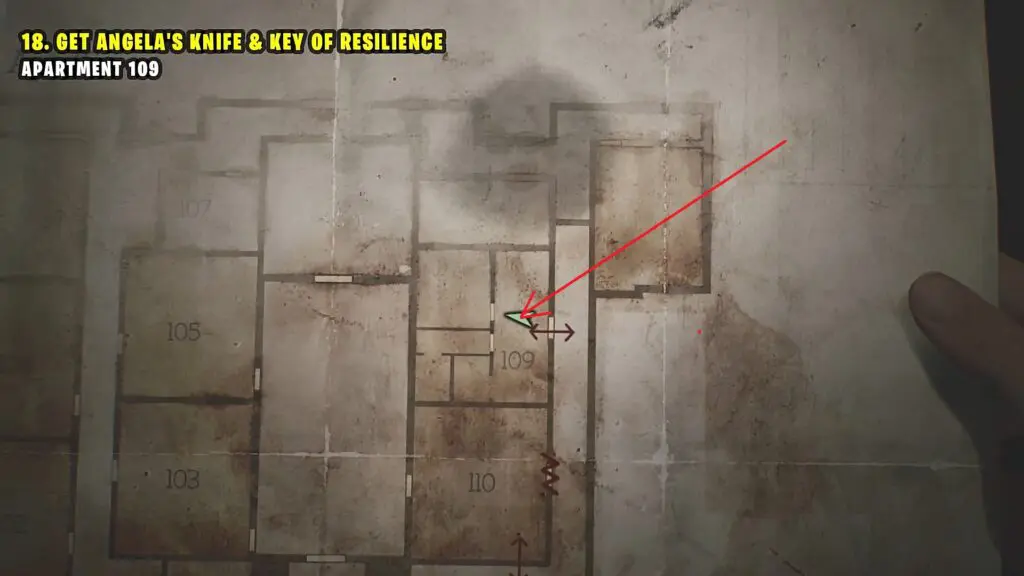 Make your way to Room 109 as shown in the picture below. Go inside and open the door straight ahead for a cutscene. You will get Angela’s Knife during the cutscene. Then collect the Key of Resilience from the table there.