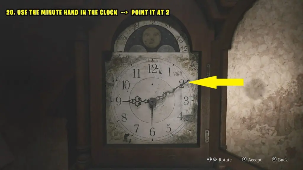 Interact with the clock and insert the Minute hand. Then point the Minute hand to ‘2’ as shown in the picture below. This will open the door marked with ‘M’.