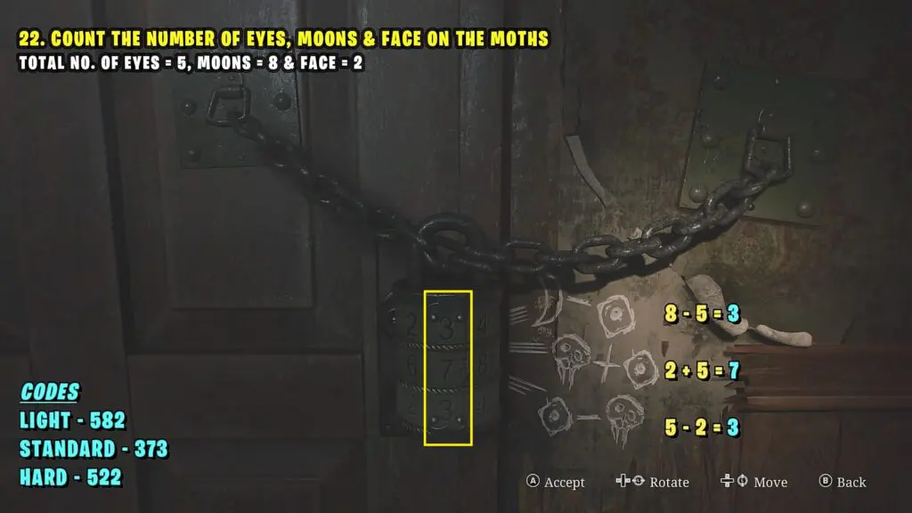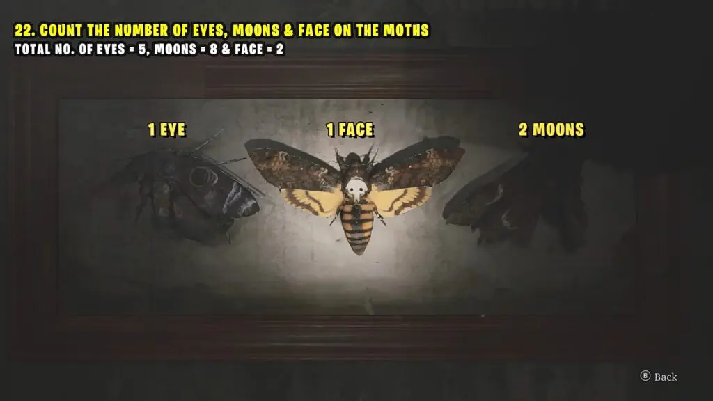 Inside the room, you will find several giant moths with Eyes, Faces, and Moons drawn on them as shown in the picture below. To solve the puzzle, you will need to count all the Eyes, Faces, and Moons. One Moth will be on the sofa. There will be two Moths on two different tables. There will be three Moths in the display. Break the wall next to the display and enter the room ahead. Move the cabinet inside the room and you will find two more Moths in display there. Now add all the Eyes, Moons, & Faces (Eyes=5, Moons=8, Face=2 for Standard Difficulty).