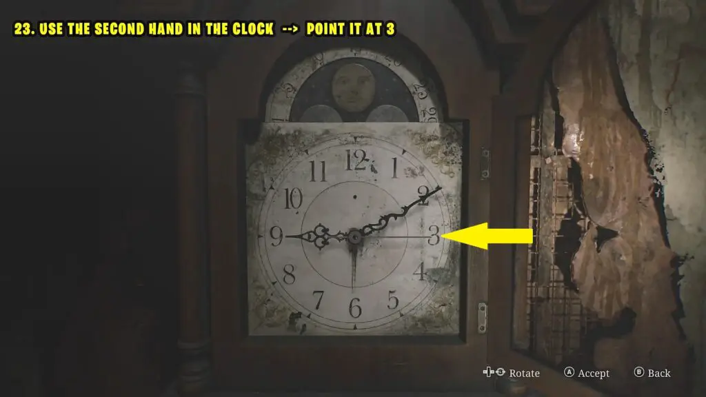 Interact with the clock and insert the Second hand. Then point the Second hand to ‘3’ as shown in the picture below. This will open the door marked with ‘S’.