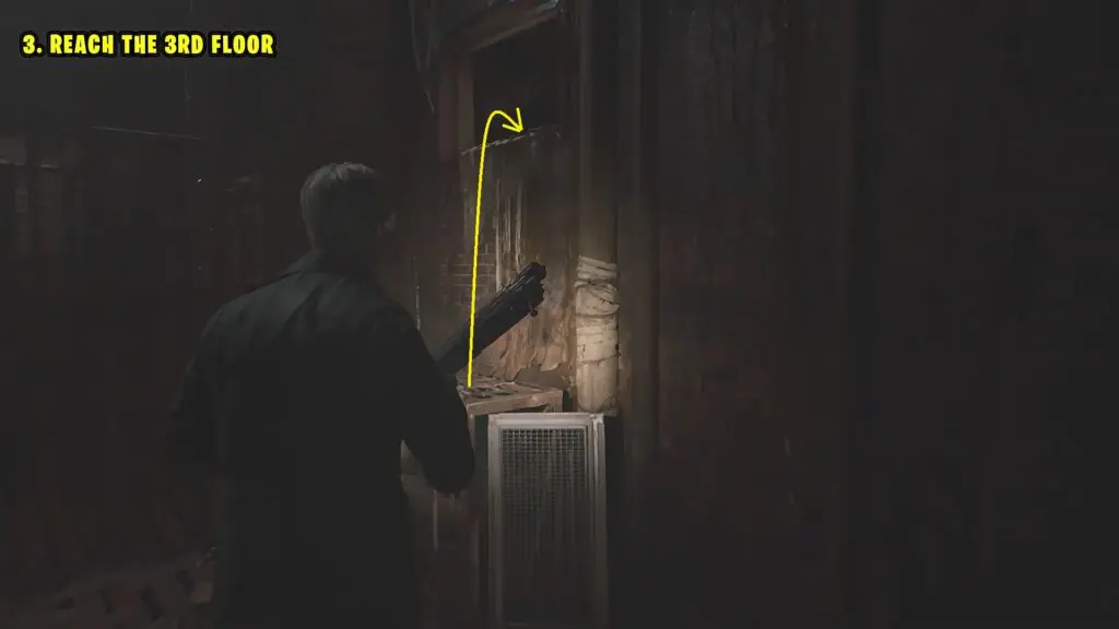 Go through the broken wall into the next room. Open the door there and then proceed ahead. Jump through the window in the room to go outside. Climb up the emergency stairs to reach the third floor. Then climb up through the hole in the wall to enter the third floor as shown in the pictures below.