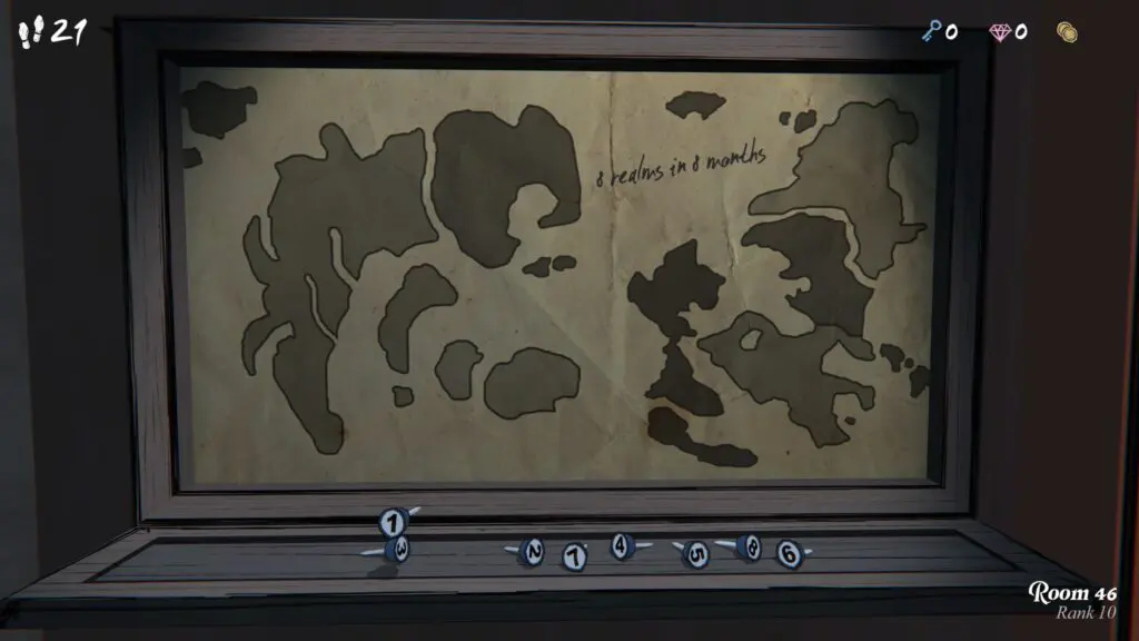 After completing the campaign, return to Room 46. Look behind the chair on the desk to find a map with pins. This is the Eight Realms in Eight Months Puzzle, featuring several continents and regions, where you can place eight pins.