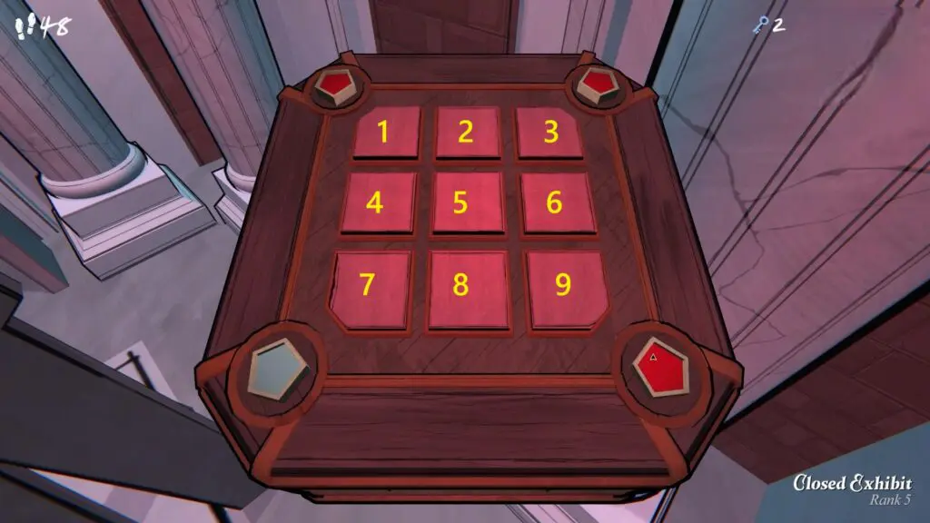 Closed Exhibit Box presents a 3×3 grid of colored tiles. To open the Exhibit box in Blue Prince, you need to change the color of each corner to match the color of its Realm. For example, if a corner has a pentagon symbol, that means it belongs to Fenn Aries, and its color should be red.