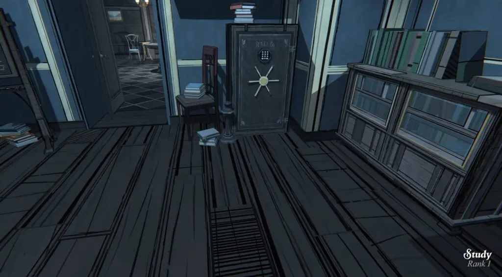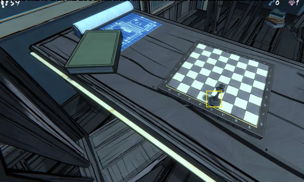 To open the safe, you’ll need the correct code. Look at the chessboard on the table nearby. You’ll notice a black King piece sitting on the square D8.