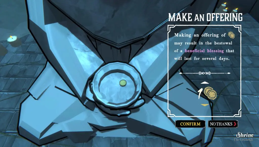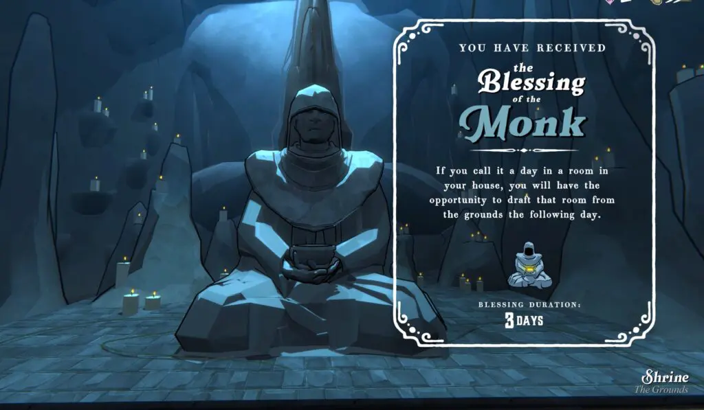 While you’re playing in the same run, draft the Shrine as an outer room and donate 13 coins there. This will give you the Blessing of the Monk.
