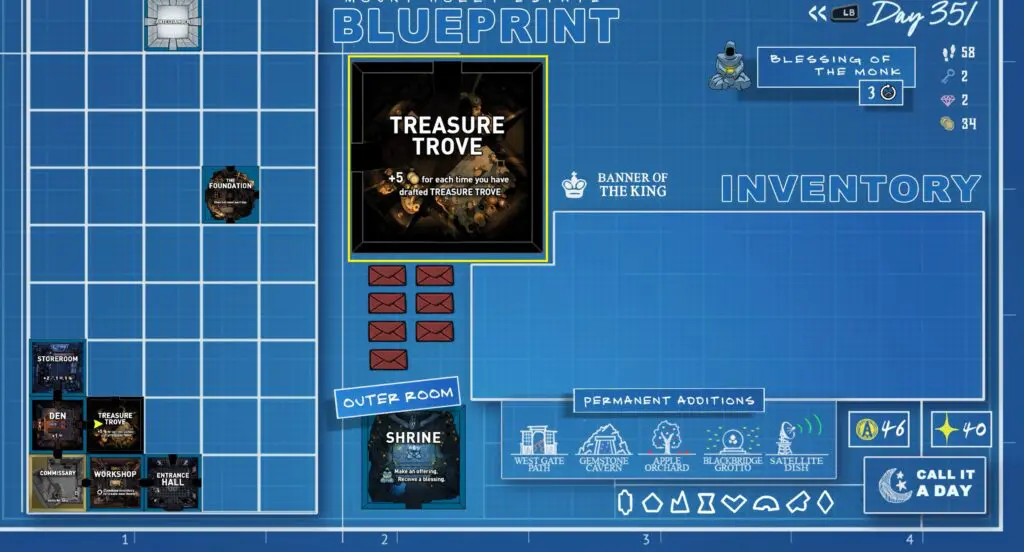 Once you have this Blessing of the Monk, draft the Treasure Trove as an outer room. You’ll be able to end your day and spend the night at the Treasure Trove.