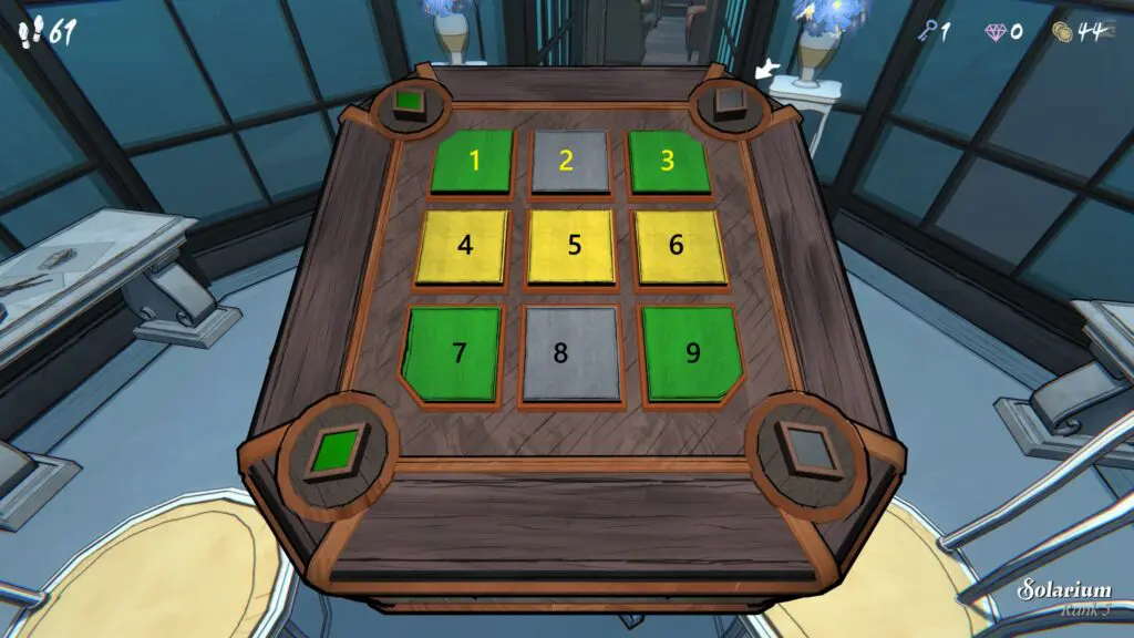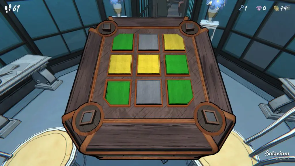 Solarium Box puzzle presents a 3×3 grid of colored tiles. To open the Solarium box in Blue Prince, you need to change the color of each corner to match the color of its Realm. For example, if a corner has a Rombus symbol, then its color should be green.