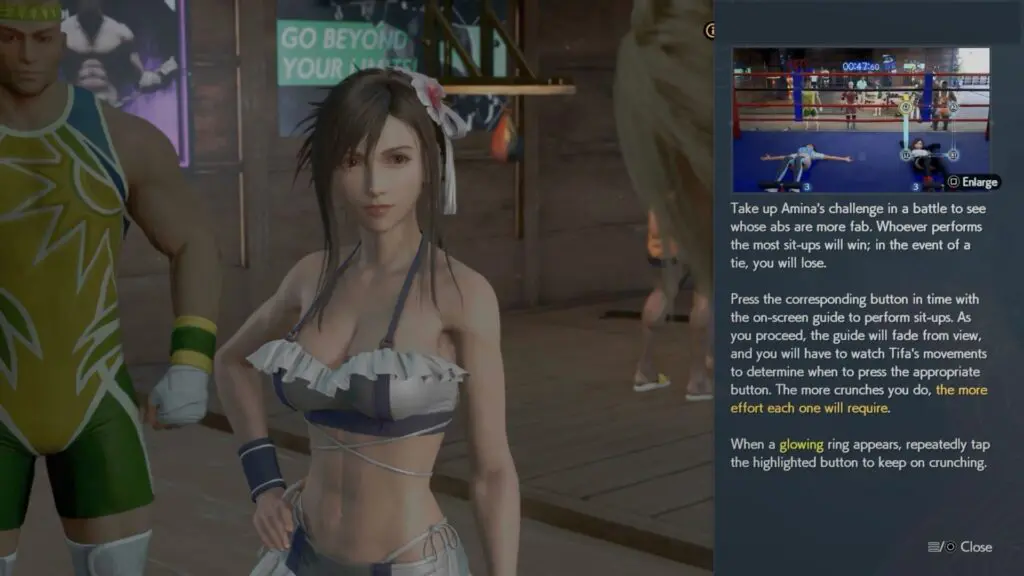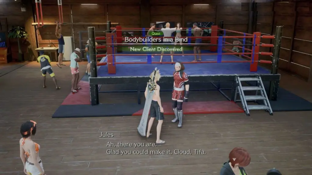 Return back to Jules at the gym. At this time Amira (NPC) will approach Tifa. She’ll challenge her to a push-up competition.