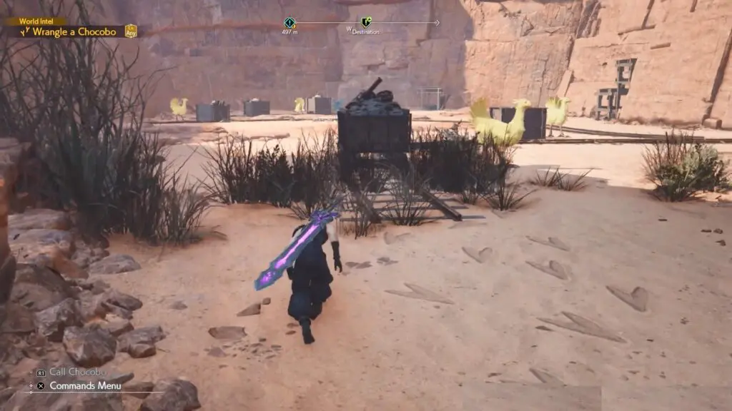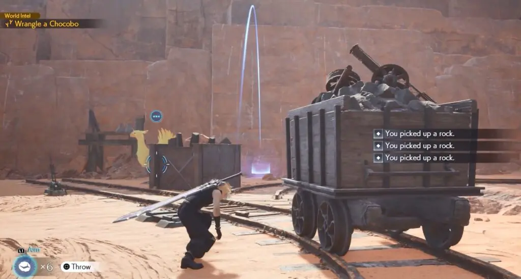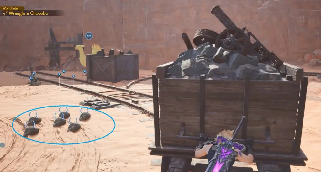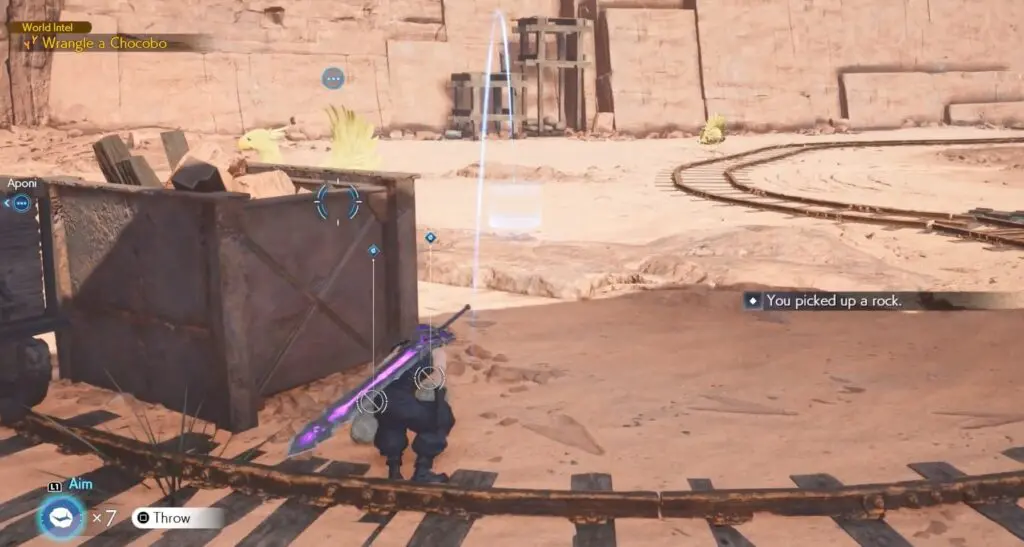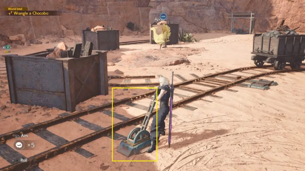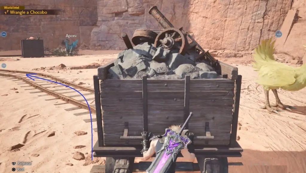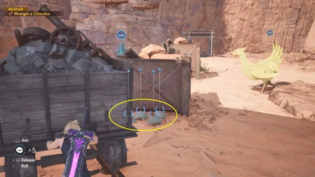 After speaking with the Kamaria, head up the slope to the north to find a group of Chocobos around mining carts. Slowly approach them. It will initiate the “Wrangle a Chocobo” World Intel, in which your objective is to capture Aponi.