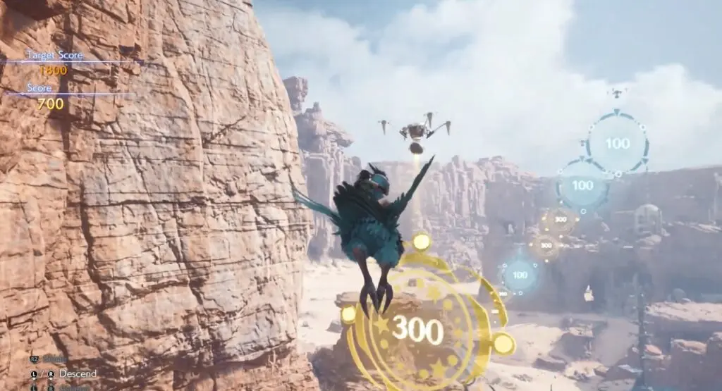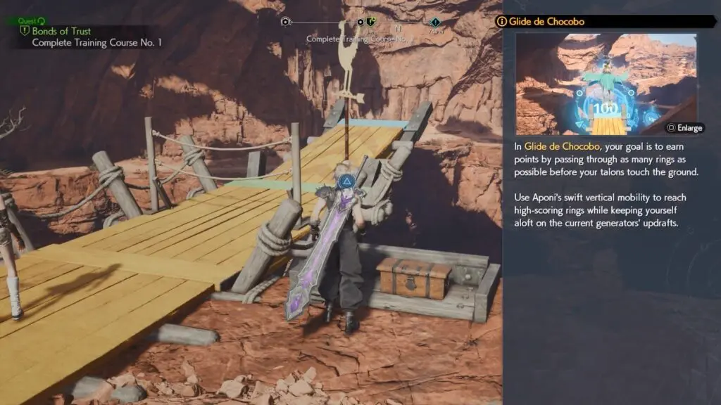 In the first training course, a player has to play the Glide de Chocobo minigame. In the mini-game, players must pass through as many rings as possible before touching the ground. To stay afloat for a longer period, use the updrafts created by current generators.