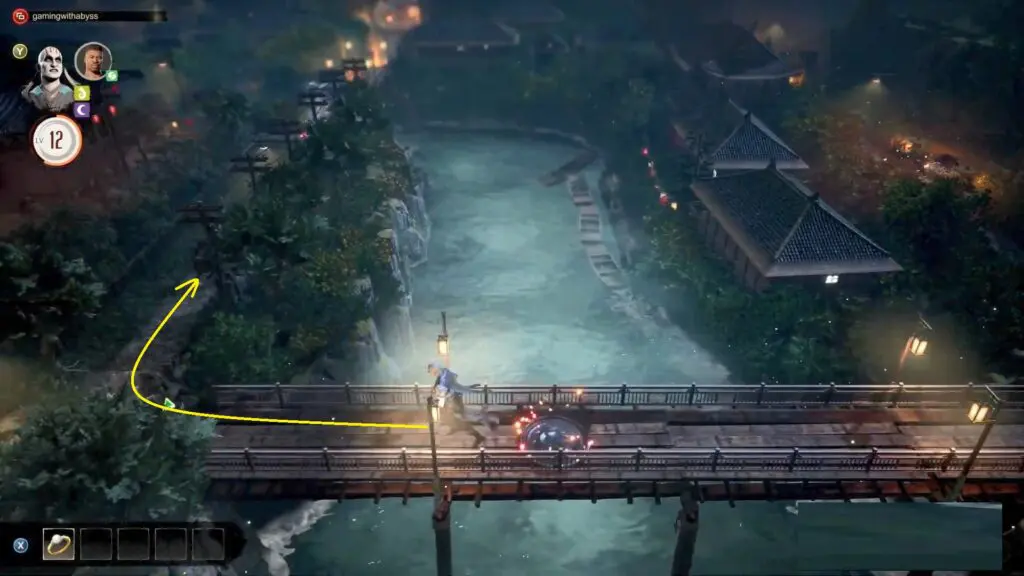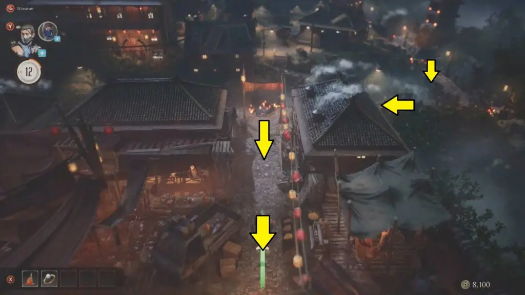 Follow the path illuminated by Chinese lanterns until you reach the final house in the village. Inside this house, you must enter and complete a challenge to proceed.