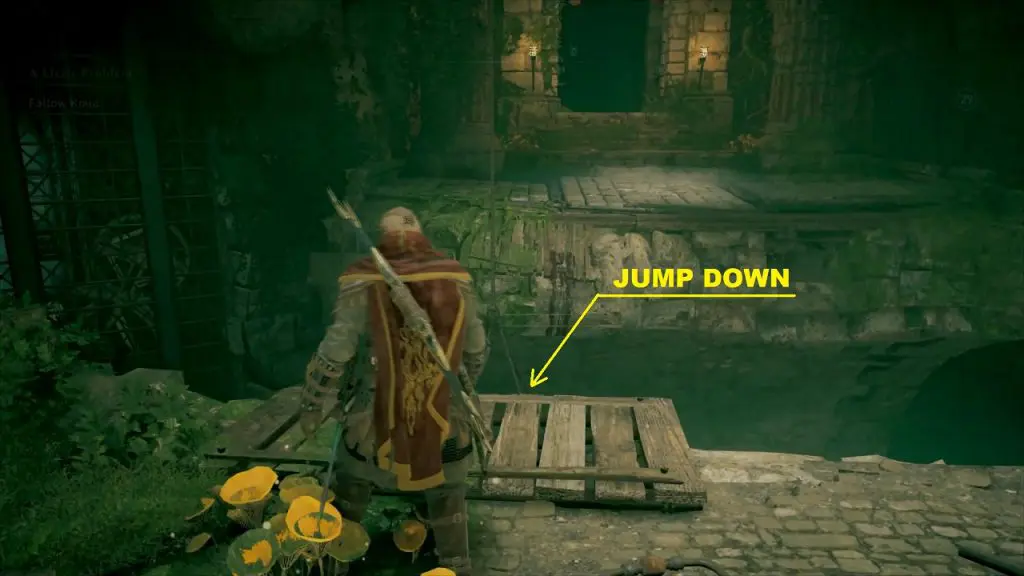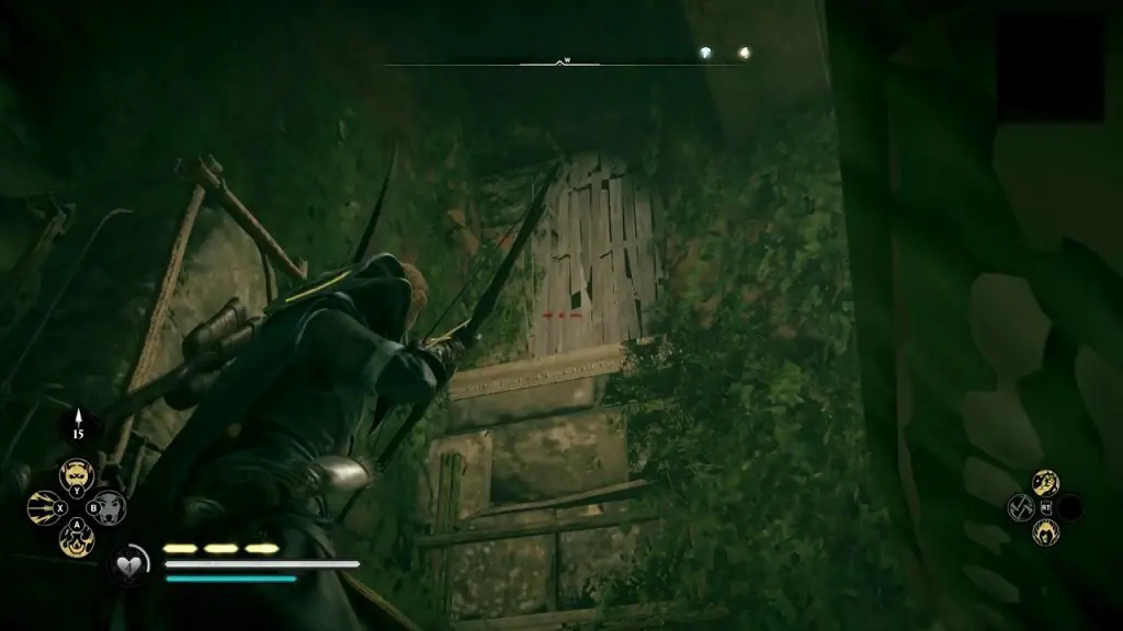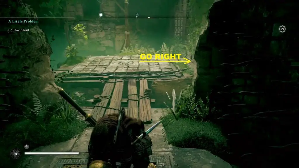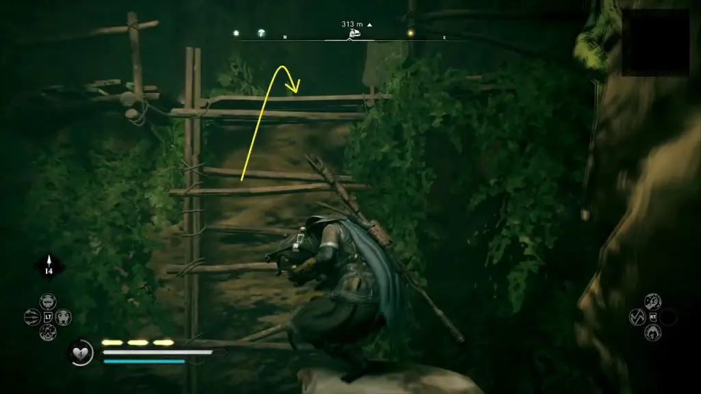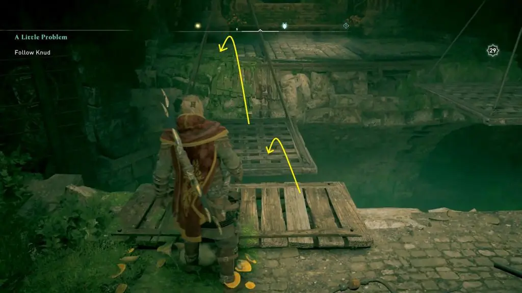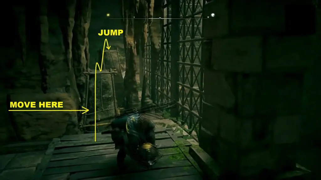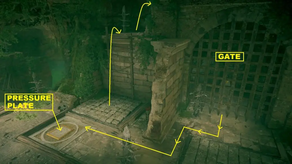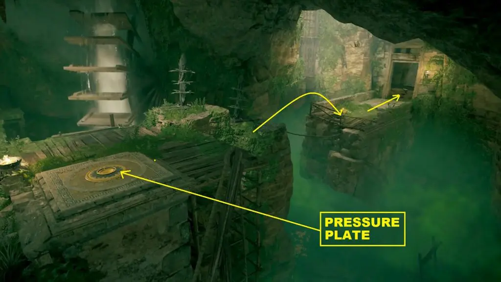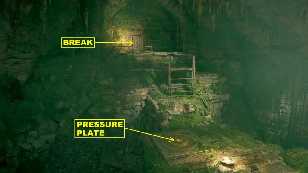 Now jump the gap to reach the other side of the room. On the left side, you will see the third pressure plate as shown below. Climb the wall near the pressure plate and break the wooden wall.