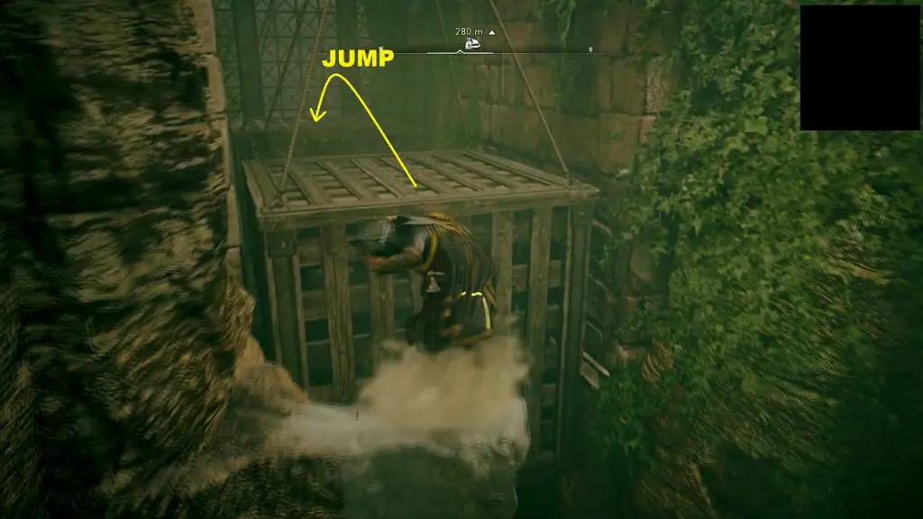 Shortly you will reach a couple of hanging cages as shown below. Quickly jump to the cage on the far end. As you stand on the cage, it will start moving down due to your weight. When the cage has moved down, jump ahead and take right. Then walk through the rope to reach the pressure plate. Place the object on the pressure plate to activate it.