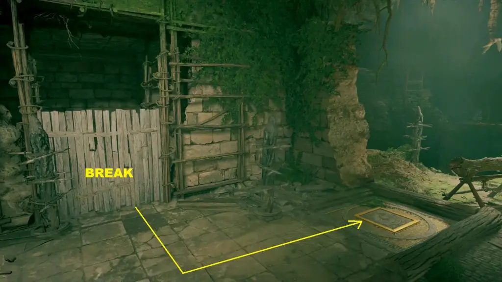 Break the wooden wall on the left side. Then go inside and slide the movable structure to the top of the pressure plate as shown below to activate it.