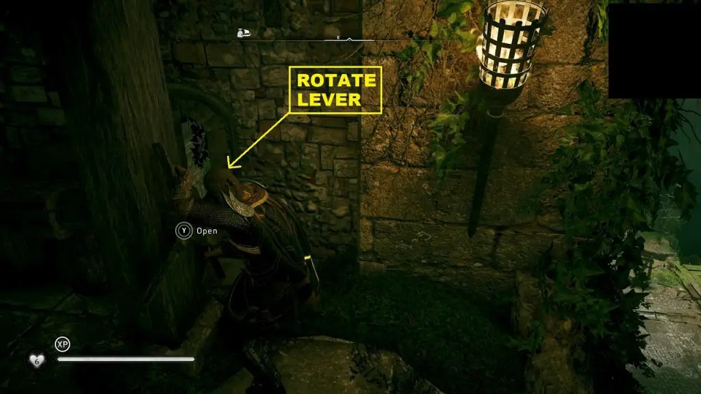 On the right side of the room, you will find another pressure plate. The Movable Structure is behind a locked iron gate as shown below. The lever that opens the gate is above it. To reach the lever, climb the wall near the pressure plate, then turn right and climb another wall and you will see the lever in front of you (See the second picture below). Rotate the lever to open the iron gate. Then go to the movable structure and slide it to the top of the pressure plate as shown below to activate it.
