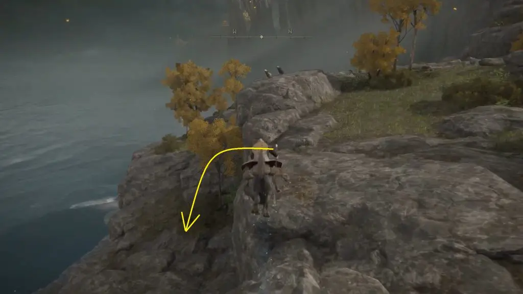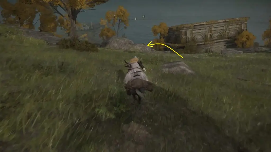 Going west, you will reach a ruined structure as shown in the picture below. Go past this structure, until you reach the edge of the cliff.