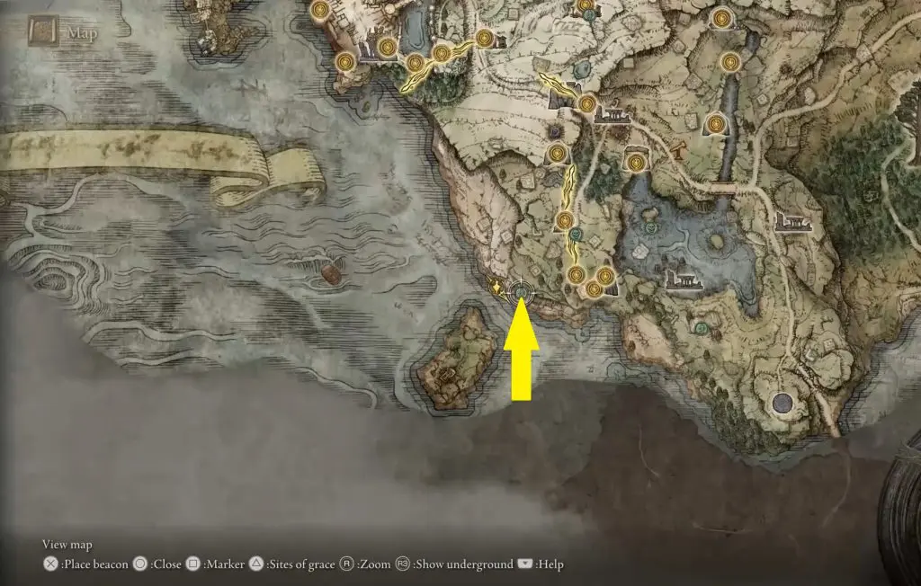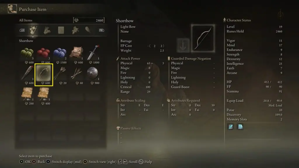 On the beach, you will find a Nomadic Merchant behind the ruined structure at the location marked in the pictures below. You can buy a Shortbow from the Nomadic Merchant for 600 Runes. You can also purchase arrows from this mercachant.