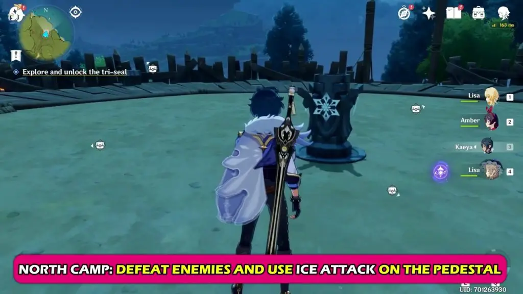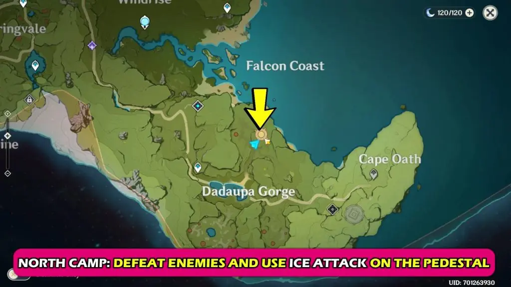 North: The Meaty Tribe– The meaty tribe is at the location marked below. After arriving at the highlighted location, you will have to defeat 10 enemies within 100 seconds. Then hit the pillar at the center with a cryo attack. This will break the cryo seal.