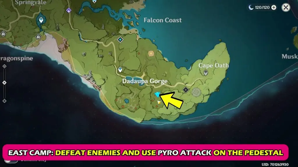 East: The Eclipse Tribe– The Eclipse tribe is at the location marked below. Defeat the enemies in the camp. Then hit the pillar at the center with a pyro attack. This will break the pyro seal.