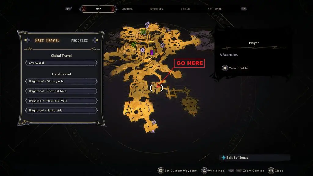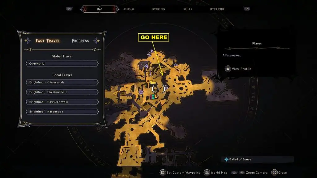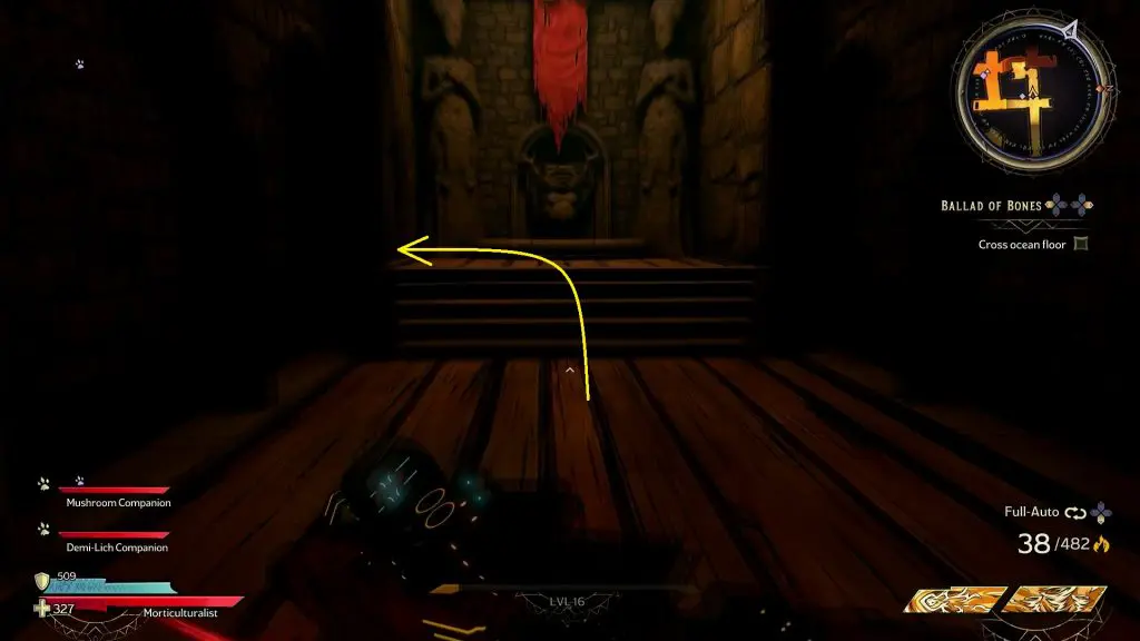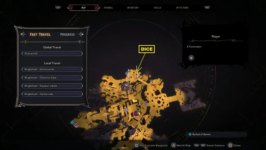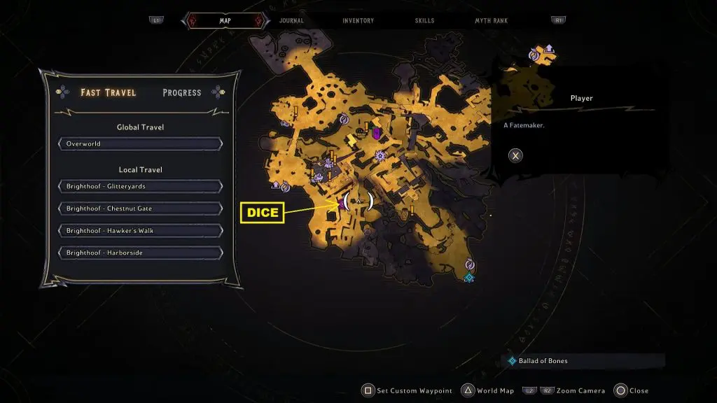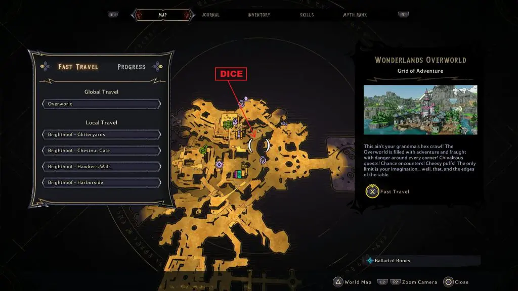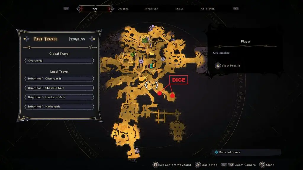 Go to the location marked in the picture below. Enter the building ahead then go right. Go down the stairs then turn left. Then go left and then again go left. Here you will see a statue straight ahead as shown in the third picture below. Go to the room on the left side of this statue. Climb up the ladder in this room to get the dice.