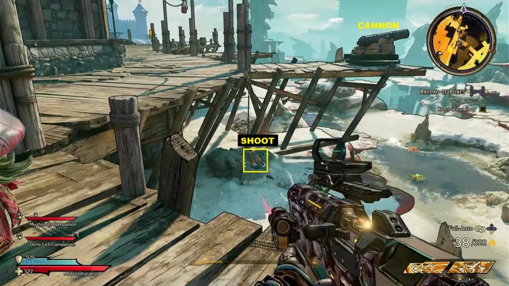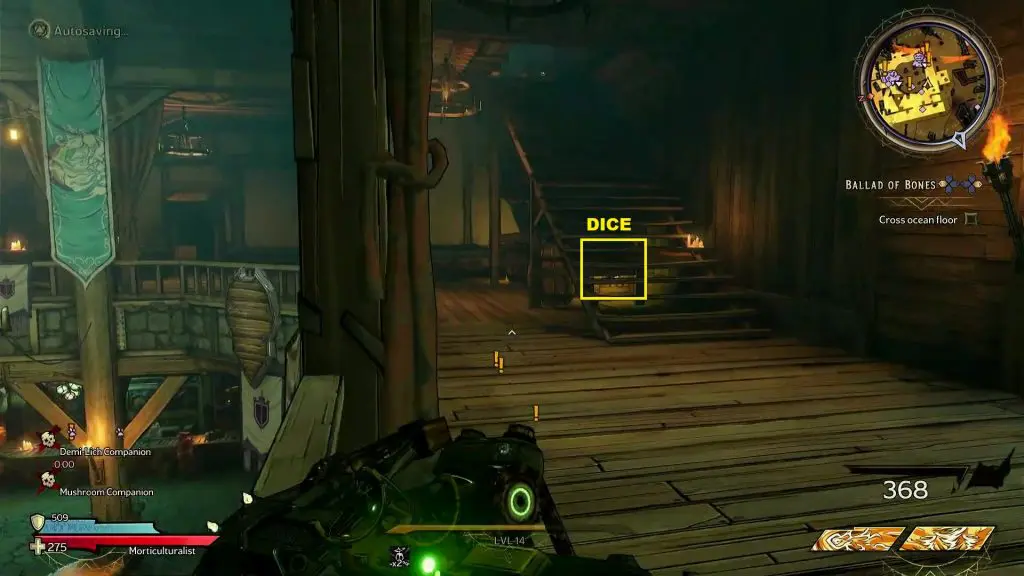 Go to the location marked in the pictures below. Here you will find a cannon. Shoot the barrel underneath the cannon to detonate it as shown in the picture below. On being detonated, the cannon will fire a shot that will blow up a door straight ahead. This will reveal the dice as shown in the fourth picture below.