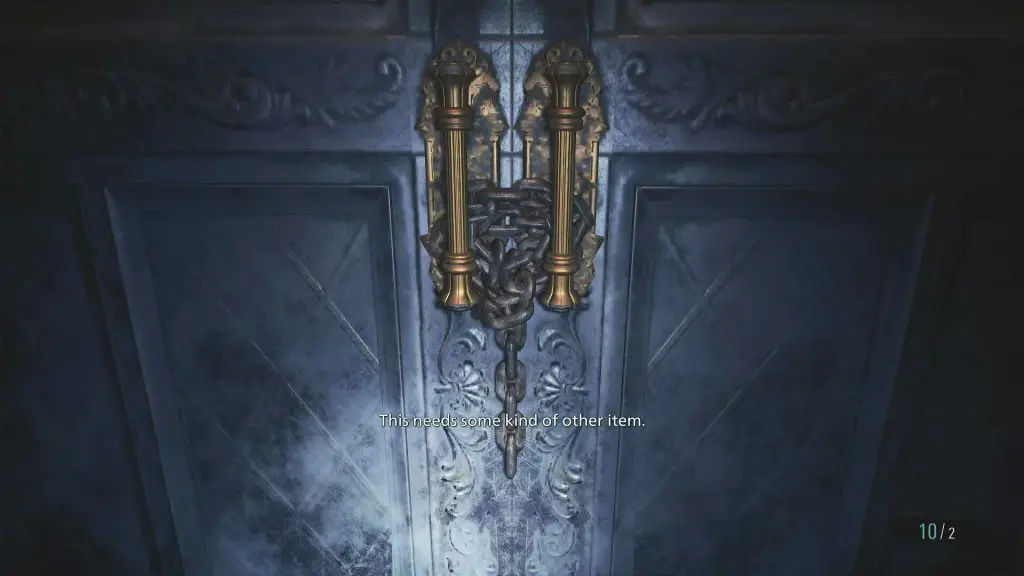 Return to the dining room and cut the chain on the door leading to the courtyard outside using the bolt cutters.