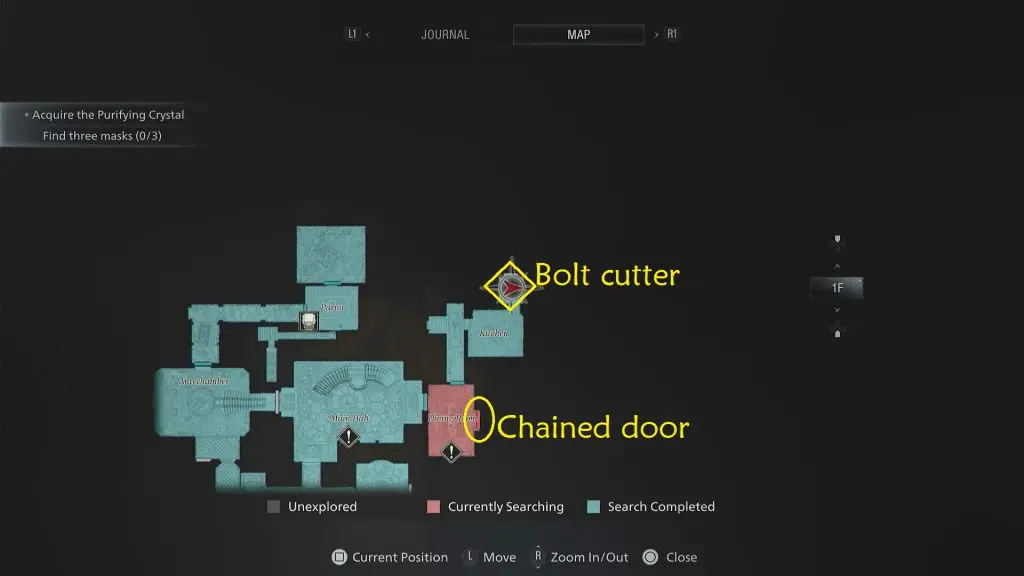 From the main hall, enter the dining room through the brown double doors. Here, you will find a chained door and you need a bolt cutter to open it.