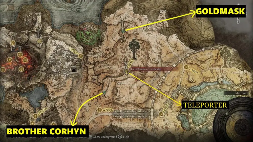 From Corhyn’s location, take the path north to reach Forest-Spanning Greatbridge as shown in the pictures below. Use the teleporter at the Forest-Spanning Greatbridge and you will be transported to the part of the bridge where Goldmask is. Travel a little south to reach Goldmask and talk to him.