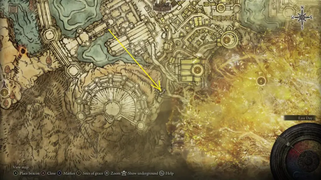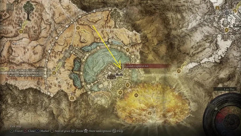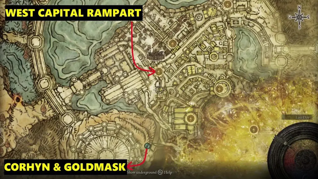 Corhyn and Goldmask at the location marked in the picture below. I will show the path from the West Capital Rampart Site of Grace.