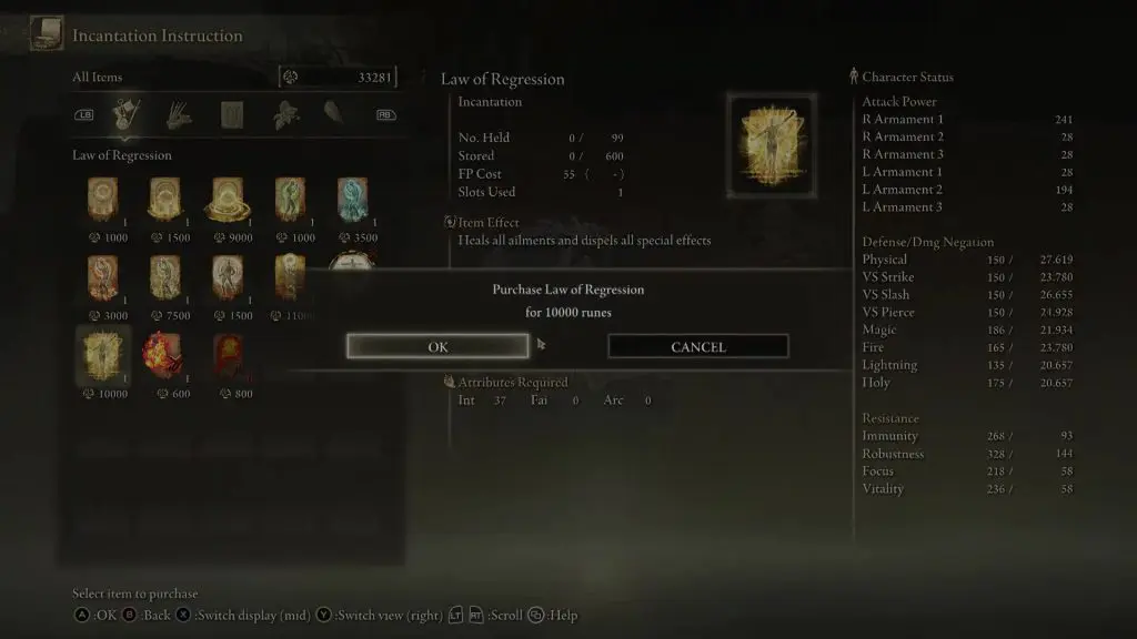 Then purchase and learn the Law of Regression Incantation Spell from Corhyn.