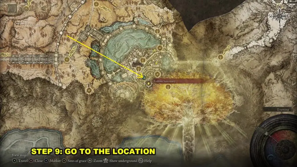Now you need to go to the location shown in the pictures below. I will show the path from the Erdtree Sanctuary Site of Grace.